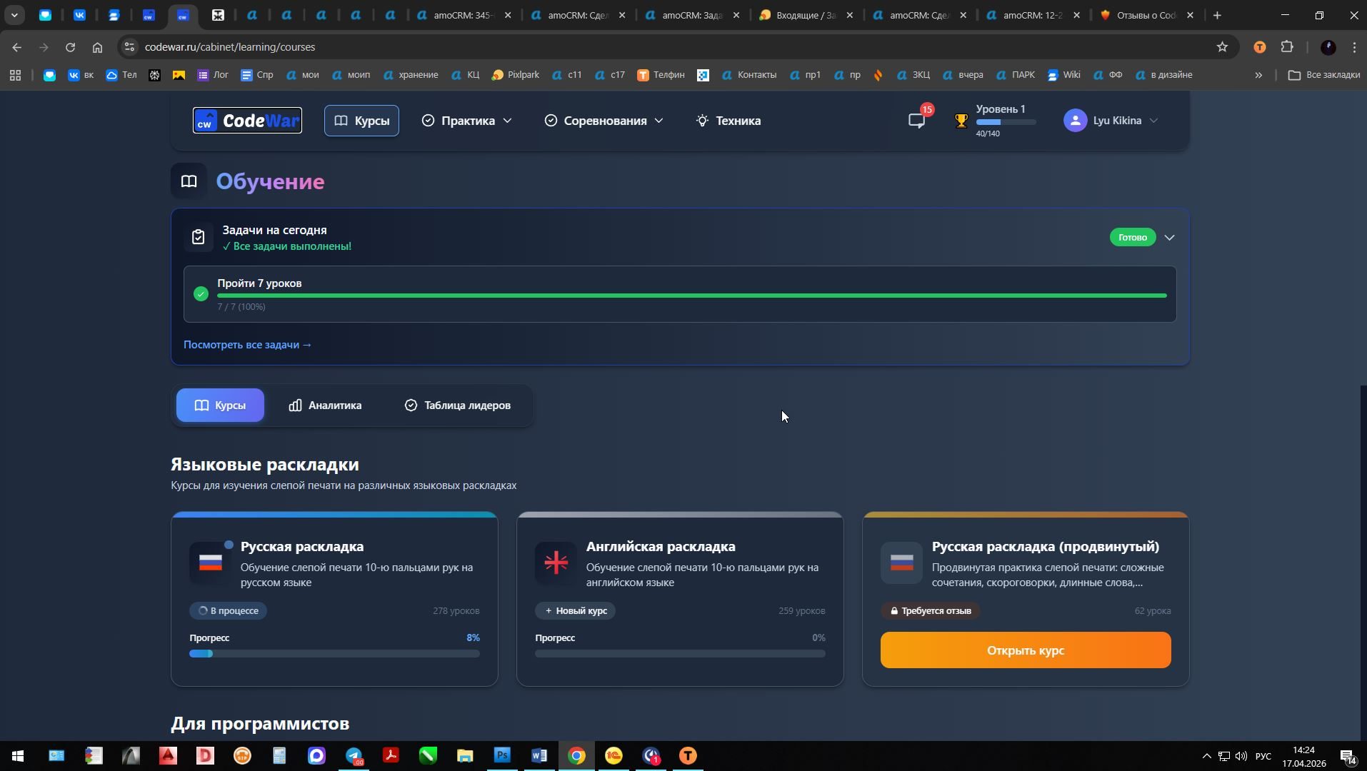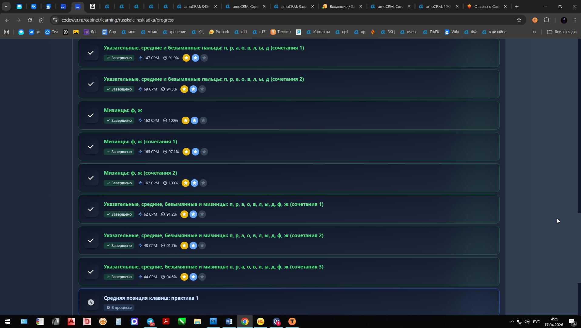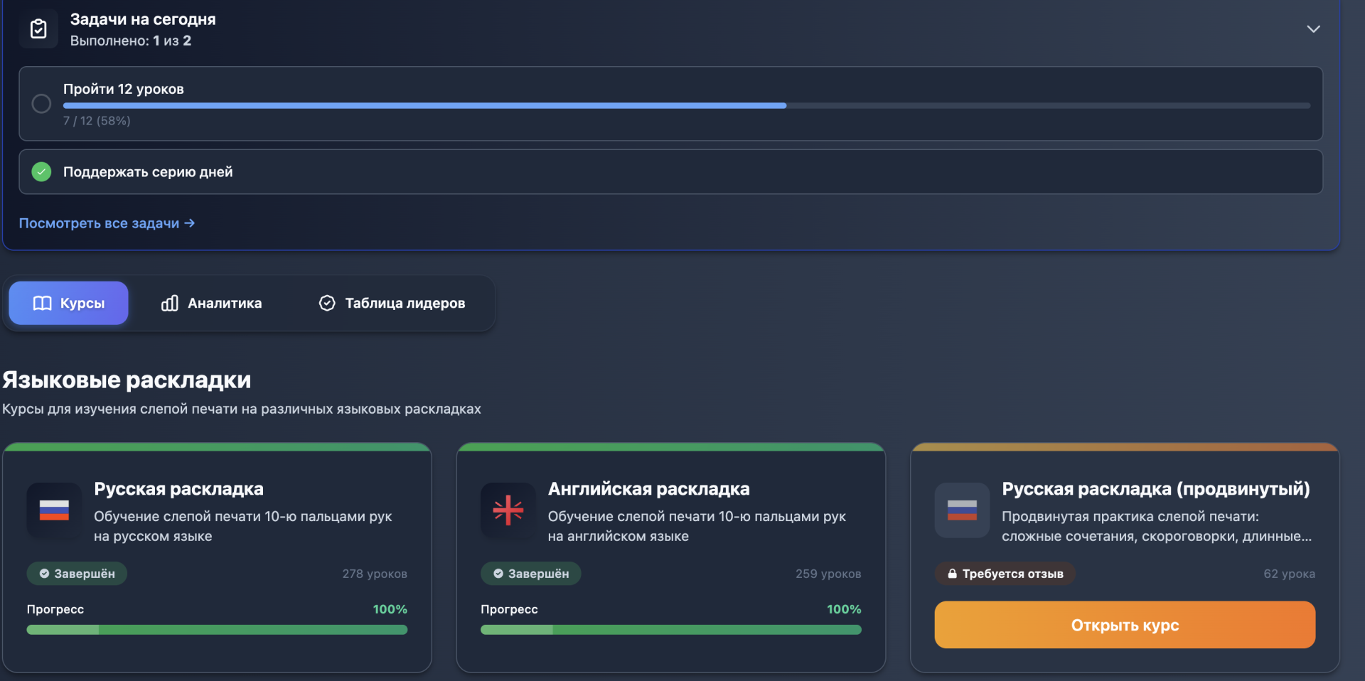 Прошёл базовый курс русской слепой печати ровно за две недели. До этого печатал двумя пальцами, постоянно смотрел на клавиатуру, скорость была около 100 знаков в минуту. Сейчас набираю 230–250 знаков, не глядя на руки — для двух недель считаю отличным результатом. Что именно проходил за это время: «Русская раскладка. Базовый ряд ФЫВА-ОЛДЖ» «Верхний ряд ЙЦУКЕН» «Нижний ряд ЯЧСМИ» Тренажёр «Слоги» Тренажёр «Случайные слова» «Марафон» (тексты подряд) Занимался каждый день по 30–40 минут. Тренажёр удобный: сразу показывает, куда ставить палец, подсвечивает ошибки, не даёт смотреть на клавиатуру. Система сама запоминает слабые буквы и повторяет их чаще — меня это реально вытащило на буквах Ъ, Ы и сочетаниях типа «ль», «нь». К концу второй недели заметил, что пальцы сами бегут по рядам, даже не думаю, где какая буква. Скриншот из истории уроков прилагаю — там видно все пройденные модули с датами (ровно 14 дней) и рост скорости. Теперь хочу взять продвинутый курс, чтобы дойти до 350–400 знаков и печатать текст почти со скоростью речи. Доступ очень нужен, спасибо.