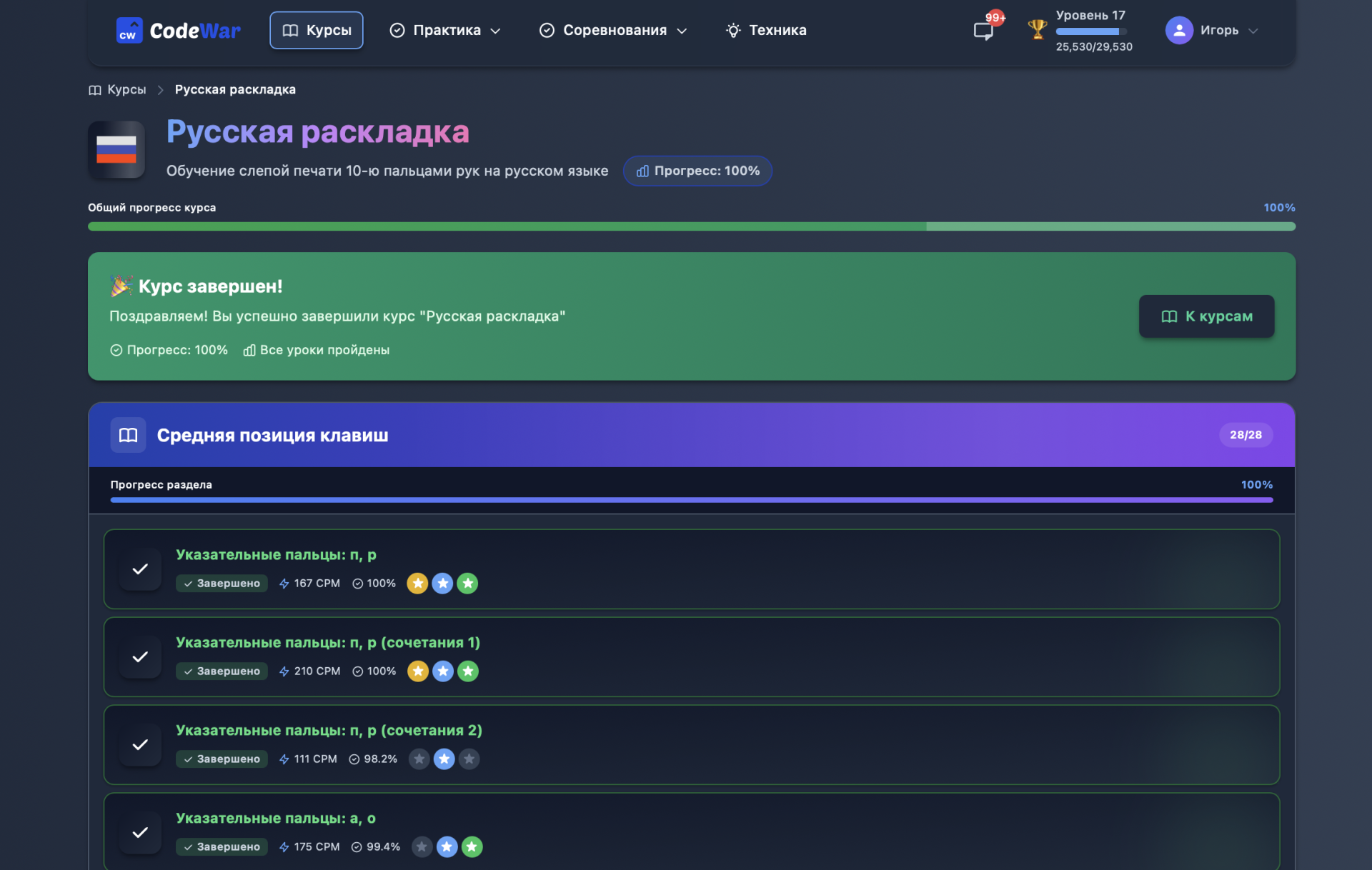 Пользуюсь CodeWar уже месяц — результат превзошёл ожидания! Сервис полностью бесплатный, никаких платных подписок. Очень понравилась структура: понятные курсы по русской и английской раскладке, детальная статистика прогресса и крутые игровые режимы, которые реально мотивируют. Скорость печати выросла со 120 до 300 символов в минуту — в офисе заметили. Отдельное спасибо за тренажёры для программистов! Всем, кто много работает за компьютером, настоятельно рекомендую. Лучшая инвестиция в свою эффективность!